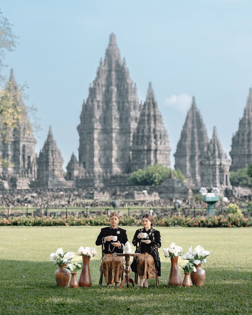 Foto prewedding dengan latar belakang Candi Prambanan memang memberikan nuansa yang lebih megah dan juga elegan. Terlebih jika didukung dengan tatanan busana dan aksesori bergaya tradisional Jawa, tentu akan menambah kesan mengagumkan ketika diabadikan dengan kamera. Keseluruhan area foto prewedding di Candi Prambanan memiliki tipe outdoor, sehingga waktu ideal untuk melangsungkan sesi pemotretan di sini adalah pagi hari sekitar pukul 7–10 pagi.