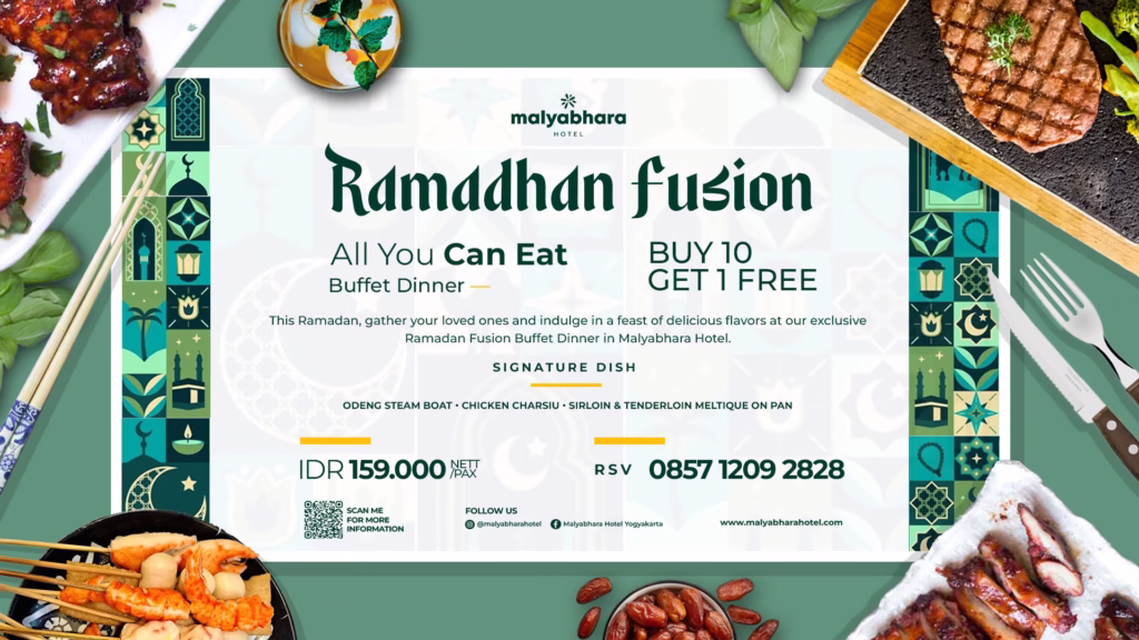 Malyabhara memberikan promo spesial ‘Buy 10 Get 1 Free’ untuk pemesanan 10 pax paket buka bersama. Promo ini bisa diklaim melalui pemesanan langsung ke Malyabhara Hotel melalui: